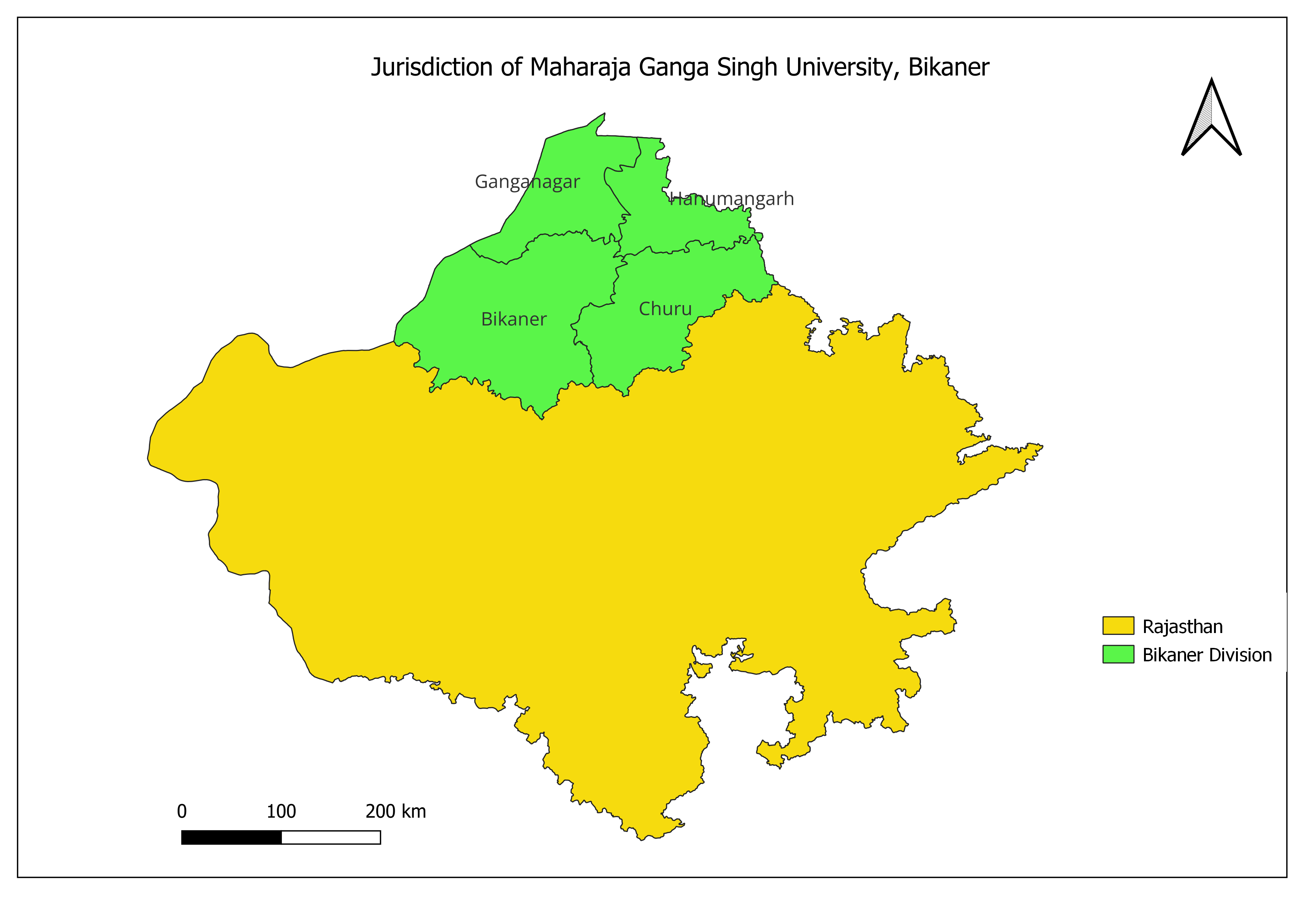 The jurisdiction of the University covers Bikaner division which includes Bikaner, Sriganganagar, Hanumangarh and Churu districts.